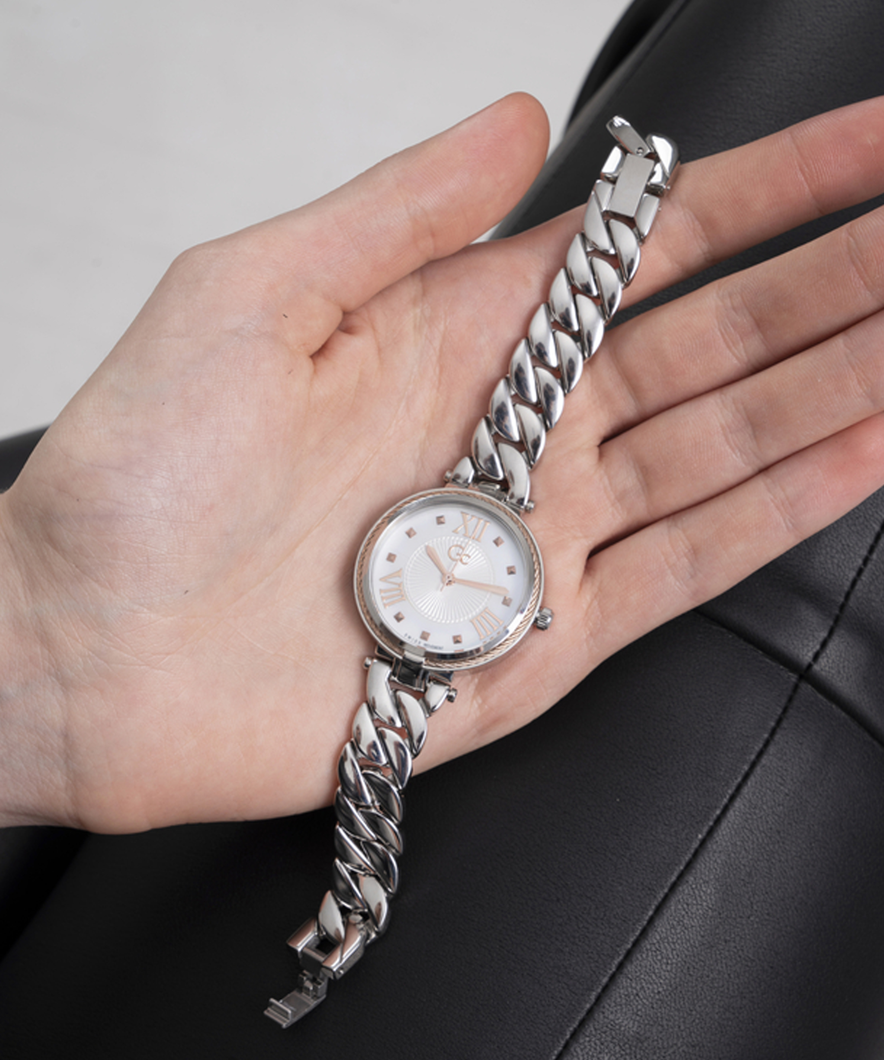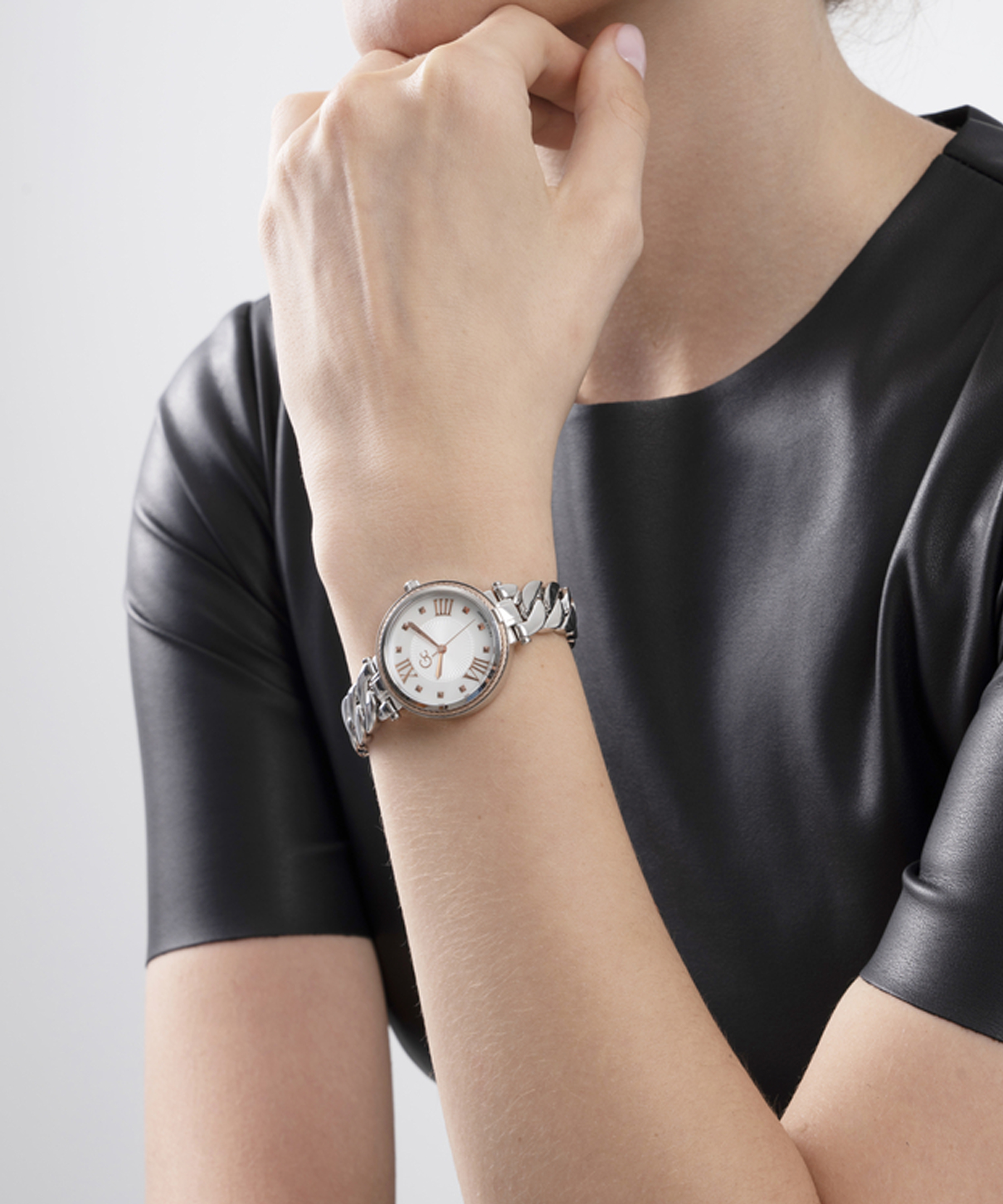 Изготовленные из стали высокого качества, эти часы сочетают в себе современность и классическую элегантность. Белоснежный перламутровый циферблат с золотистыми идексами времени и римскими цифрами прекрасно гармонирует с декоративным жгутом, характерным для бренда, что придает ему особую утонченность. Сапфировое стекло повышенной прочности с антибликовым покрытием обеспечивает надежную защиту механизма от повреждений, сохраняя его безупречный вид даже при условиях ежедневного использования. Оригинально сплетенные звенья браслета придают особый шарм, превращая часы в стильное украшение.